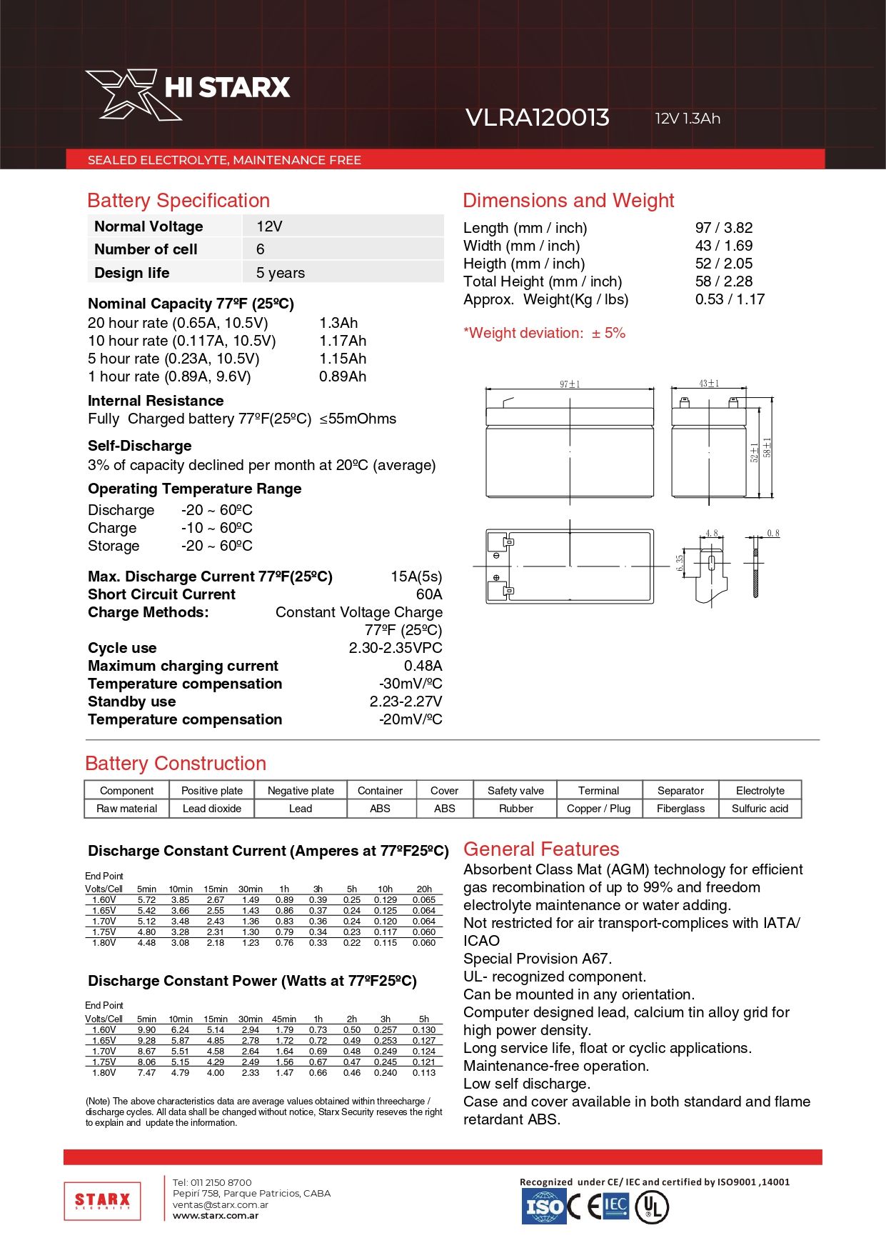 Batería de electrolito absorbido VLRA 12v 1.3ah